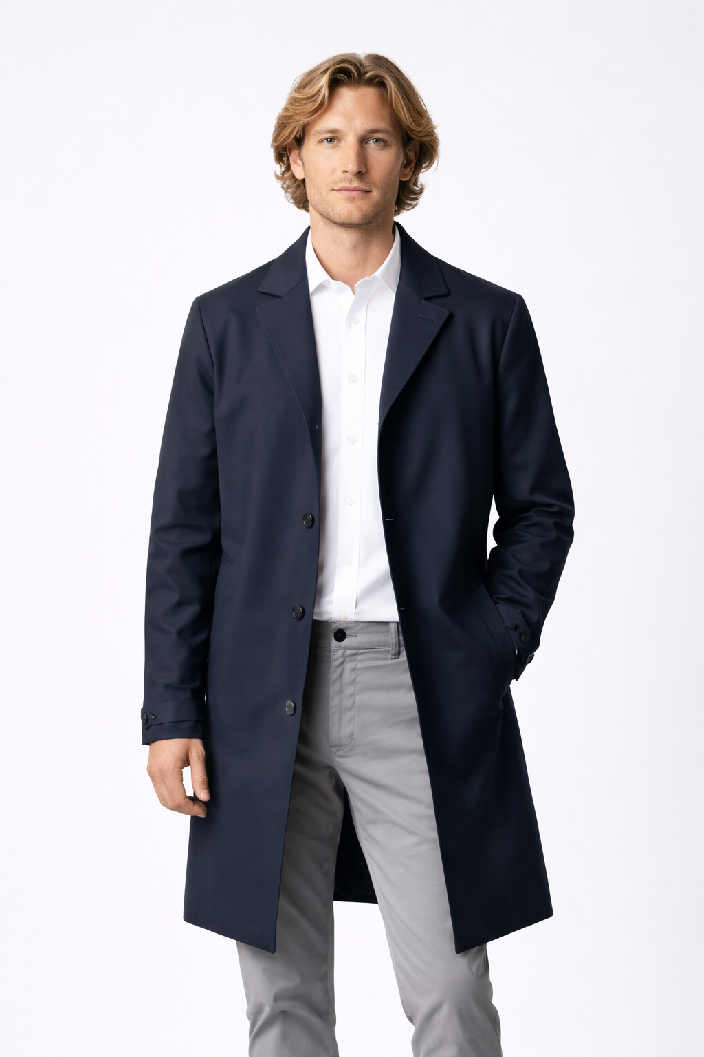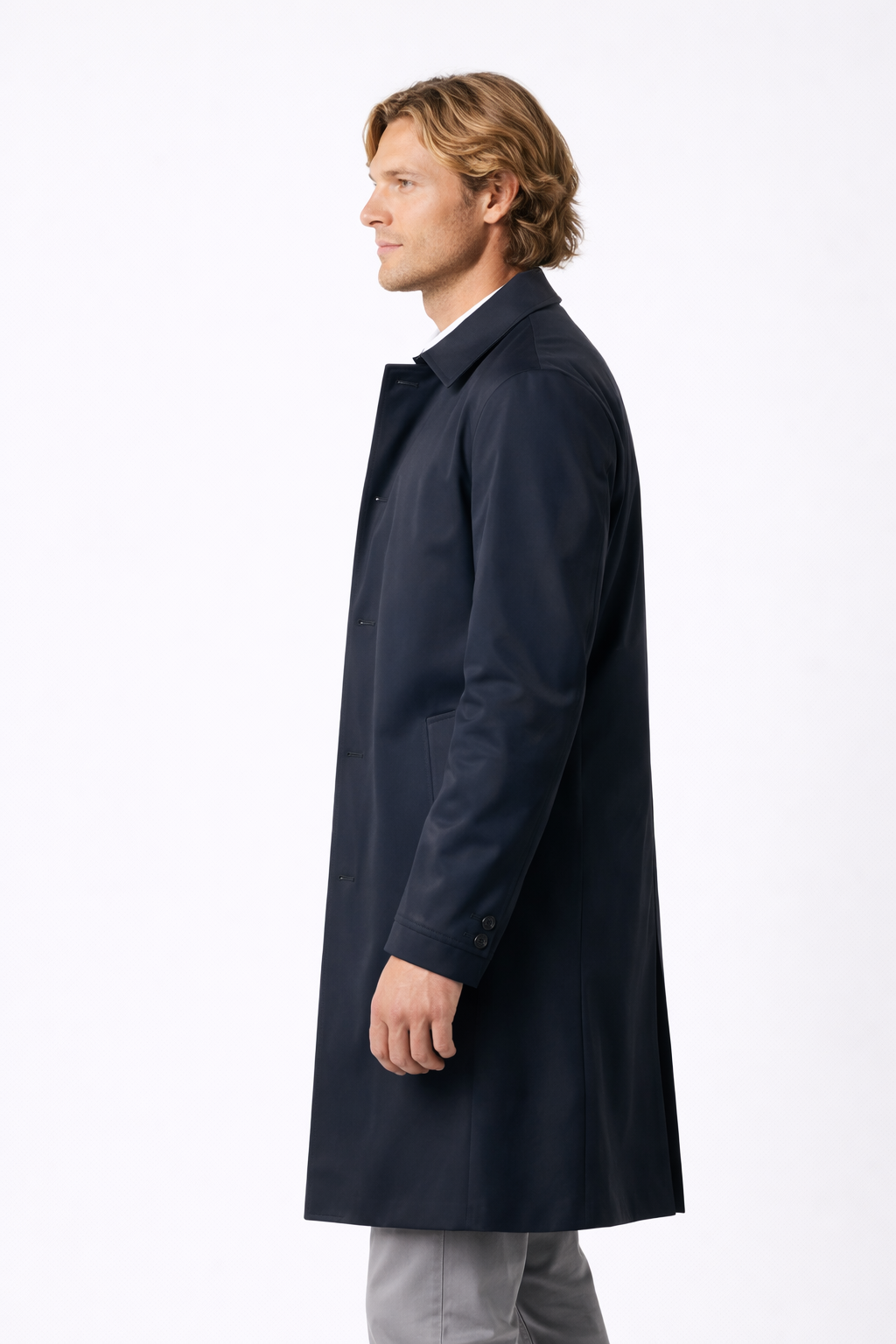 A refined outer layer designed for everyday protection, the Midnight Blue Rain Coat is crafted from a technical fabric with a smooth, structured finish. Fully rainproof and windproof, it offers reliable performance without compromising on style. The knee-length silhouette is finished with horn buttons, a classic notch lapel, and four-button working cuffs, delivering a timeless, tailored look. Angled side pockets and a centre vent ensure ease of movement and everyday practicality.
